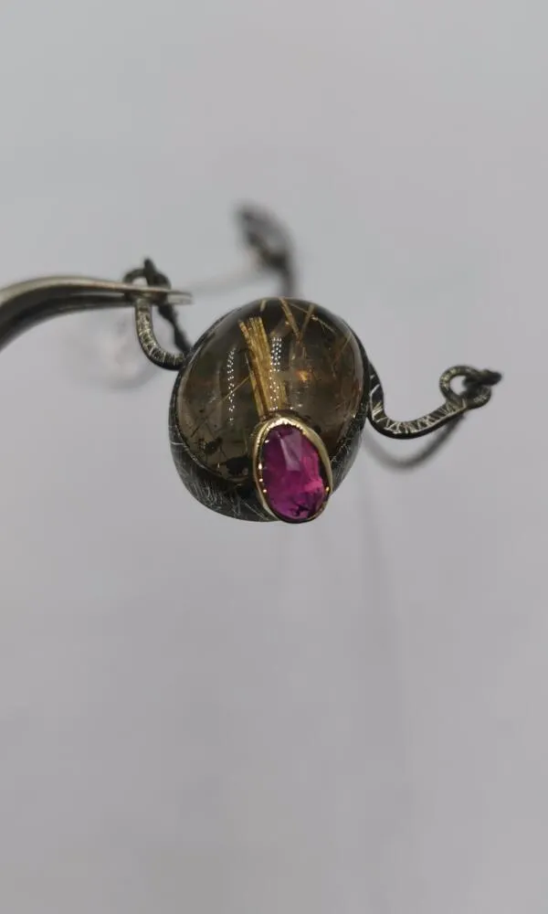 SG392 / Gold K18 and silver rutilated quarz and tourmaline pendant