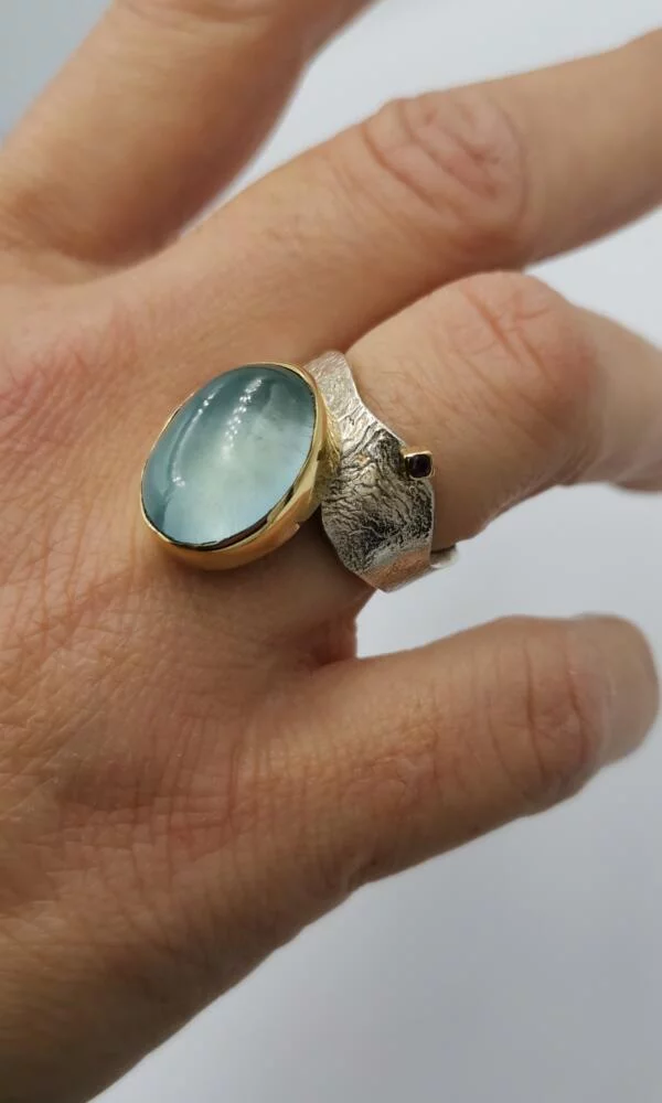 Marquise shape ring…Main gem stone a perfect water melon tourmaline and two smaller cabochon tourmalines in similar colour!!Golden bezels K18 and silver 950..