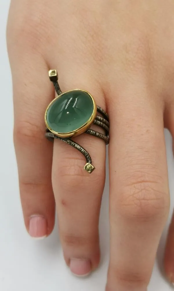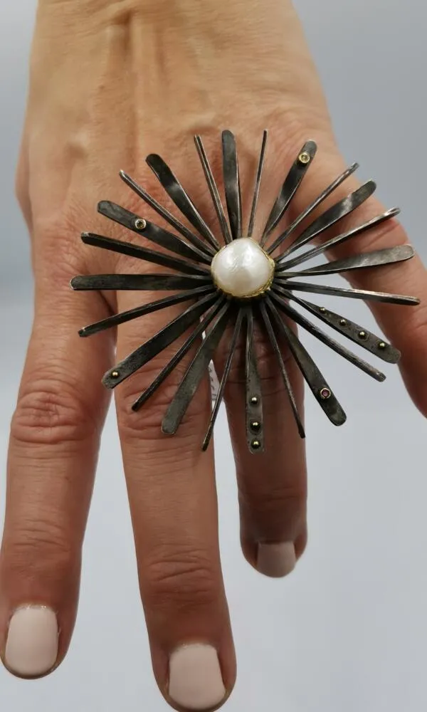A beautiful silvergold piece of art consisting of ruby. A special design for all those who appreciate modern rings.